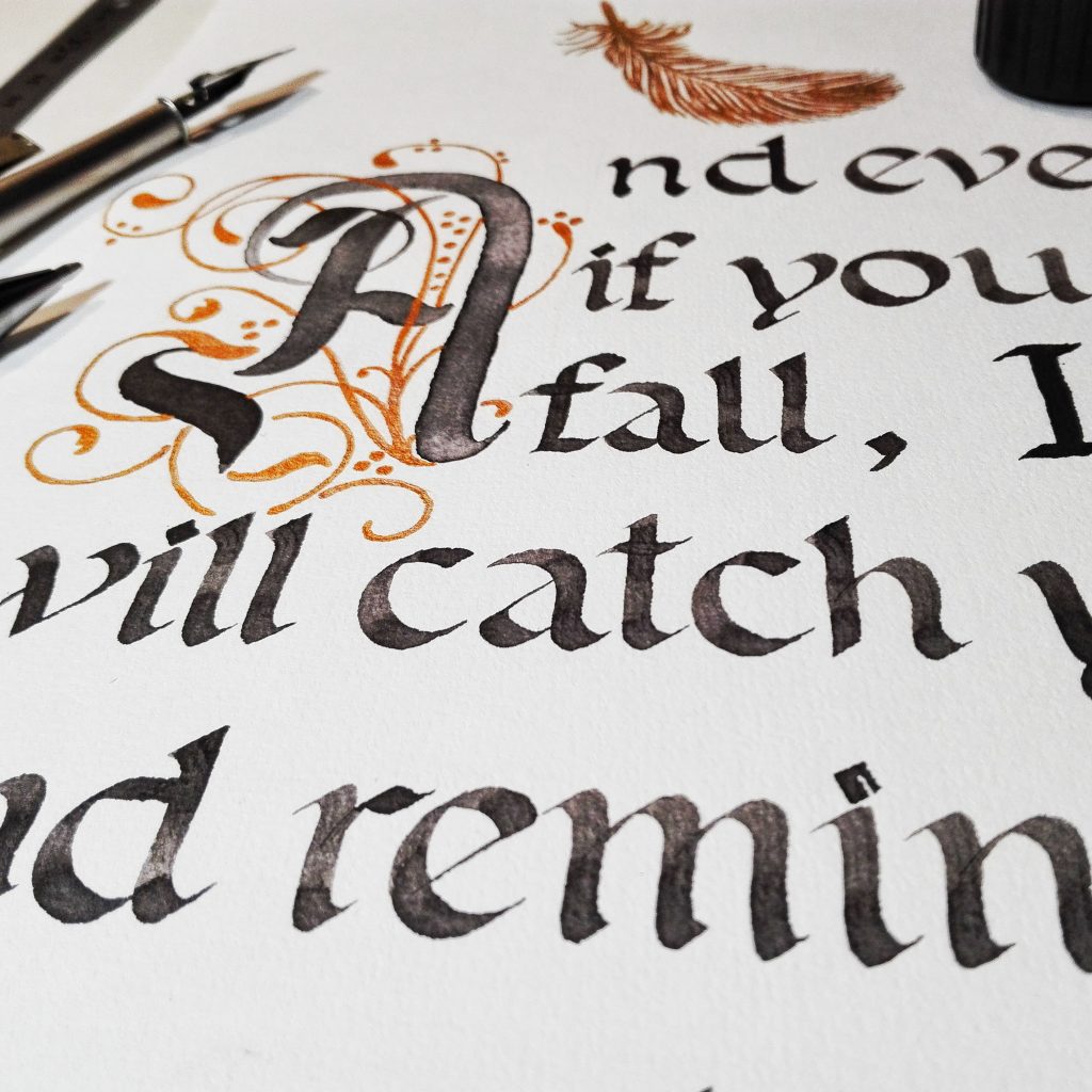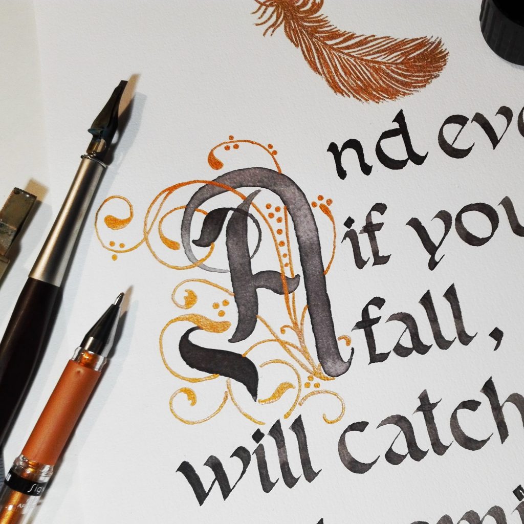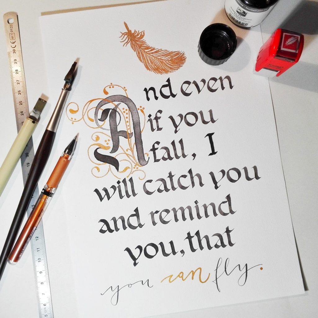 Wandbild „fly“ Wandbild. DIN A4. Initial mit Schnörkel (Flourishes) und humanistische Kursive (Schrift). Sepiatusche & Gold-Bronze-Elemente. Automatic Pen, Breitfeder, Spitzfeder & Gel-Pen.